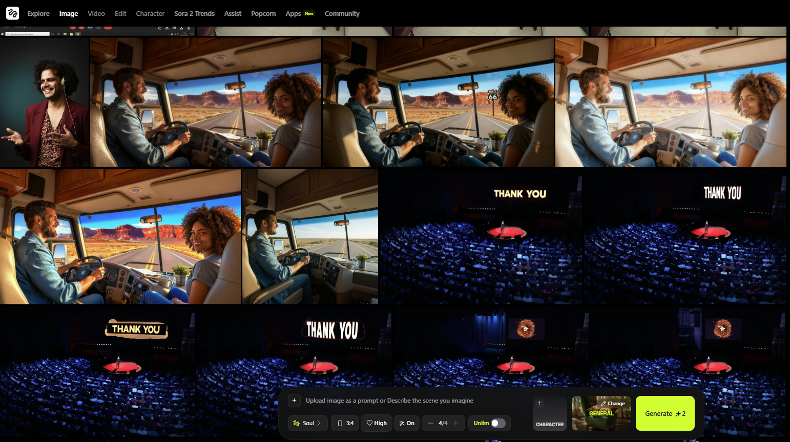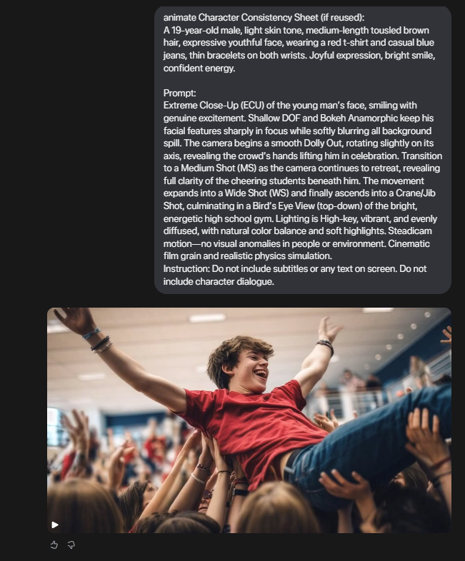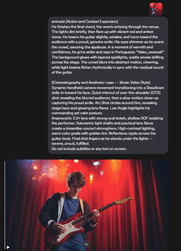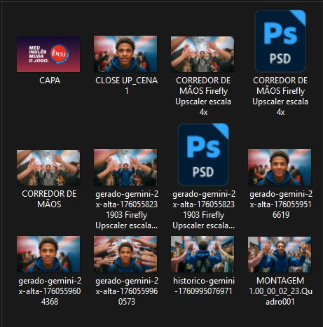 Para isso, desenvolvi uma engenharia de prompts complexa, especialmente desafiadora nas cenas com público e multidões, onde a IA tende a alucinar detalhes como mãos e braços. O domínio dos prompts foi essencial para alcançar consistência visual e realismo.